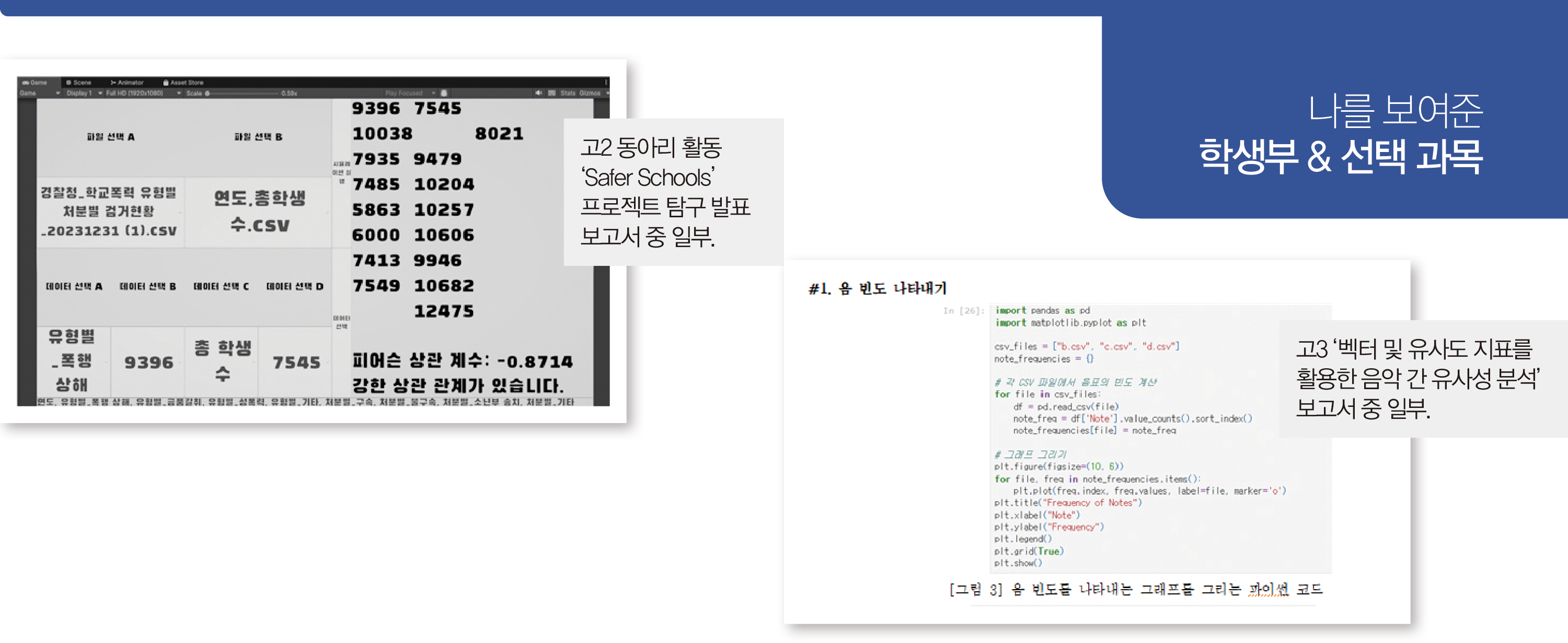“2학년 때 ‘Safer Schools’라는 학교폭력 예방 및 대응 시스템을 개발했어요. 공공데이터포털에서 학교별 범죄 데이터를 수집해 항목별로 정리한 뒤, 피어슨 상관계수를 활용해 변수 간 관계를 분석했습니다. 상관계수를 적용해보니까 특정 변수들 사이에서 일정한 패턴이 드러나더라고요. 이 결과를 시각화하기 위해 파이썬으로 그래프를 나타냈는데, 데이터 전처리 과정에서 누락된 값이 많아 처리 방식에 대한 고민이 컸습니다. 여러 방식으로 데이터를 정리해보면서 결과를 비교했고, 그 과정에서 데이터를 어떻게 정리하느냐에 따라 결과가 달라질 수 있다는 걸 확인할 수 있었어요. 같은 데이터라도 기준을 어떻게 잡느냐에 따라 전혀 다른 결과가 나오더라고요. 그래서 사람들이 데이터를 쉽게 이해할 수 있도록 시각화에 더 신경을 썼죠.”